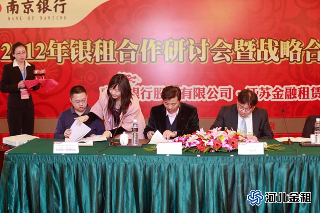 此次會議,我公司與南京銀行在綜合授信、資金融資、應(yīng)收租賃款回購、聯(lián)合融資、理財(cái)資產(chǎn)推薦、客戶推薦、投行業(yè)務(wù)等方面達(dá)成了合作共識,為致力于建立長期、穩(wěn)定、互利、共贏的全面戰(zhàn)略合作伙伴關(guān)系,不斷提升雙方的合作深度與廣度,公司總裁徐敏俊與南京銀行副行長禹志強(qiáng)在簽字儀式上簽署了《戰(zhàn)略合作協(xié)議》。